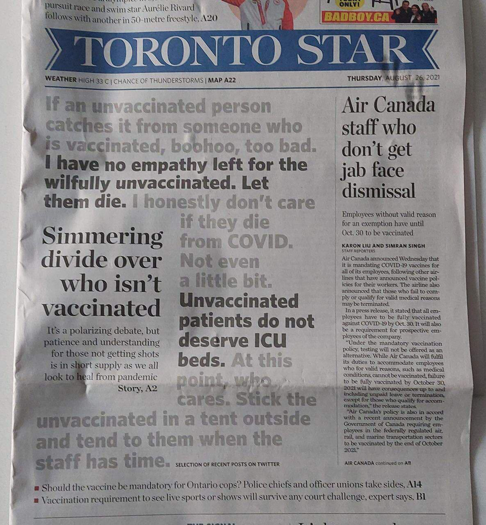 The front page of the August 26, 2021 issue of the Toronto Star is a repulsive condemnation of the unvaccinated. No Empathy for the Unvaccinated, and not caring if they die; it’s a terrible reflection of the fear and division being used to divide society. If you were to substitute “unvaccinated” with a gender pronoun, skin colour or religious faith, it would be totally unacceptable. When society (media) encourage vilification of a segment of society, hatred and violence inevitably follow. The “vaccinated” are being convinced that the unvaccinated are a threat to their health and safety. Source: https://www.reddit.com/r/CoronavirusCirclejerk/comments/pc85j4/my_jaw_is_actually_dropping_right_now_so_this_is/